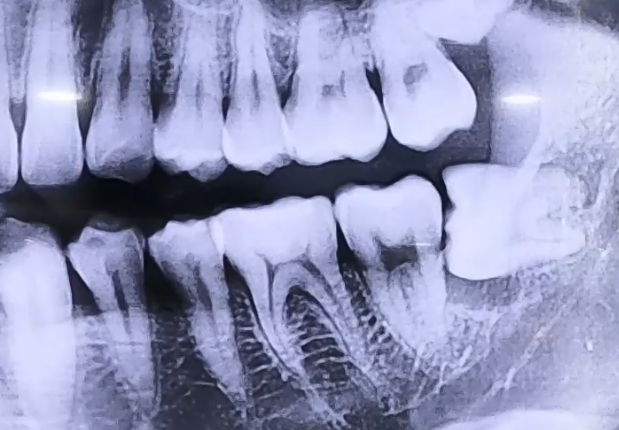 사랑니로 인한 극심한 통증으로 내원해 주신 환자분입니다. 검사를 진행해 보니 매복 사랑니를 갖고 계셨고, 이 사랑니 아래쪽으로 잇몸에 염증이 생겨 잇몸뼈들이 녹아내리고 있었는데요. 해당 부위의 잇몸이 전반적으로 약해져 있었기 때문에 사랑니 발치 후 그 앞쪽 어금니들의 상태도 주의깊게 살펴야 했습니다. 다행히도 어금니는 많이 흔들리지는 않는 상황이었으므로 사랑니를 발치하고, 약해진 잇몸뼈가 회복될 수 있도록 한 뒤 뼈의 높이를 올리고 보강해 주기 위한 뼈이식 치료를 함께 진행해 드렸습니다. |