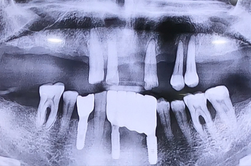 대부분의 윗니가 심하게 흔들린 후 빠진 상태이고, 남은 윗니들도 빠지기 직전인 상태로 내원하신 환자분입니다. 아랫니 상태는 양호하였으므로 상태가 많이 안 좋은 윗니의 전체 임플란트 치료를 진행하게 되셨는데요. 검사를 해 보니 오른쪽 위 송곳니는 단단하게 상태가 좋았으므로 해당 송곳니를 남겨두고 나머지 전체 임플란트를 하기로 결정했습니다. 임플란트 치료는 시간이 걸리는 치료이고, 그 기간 동안 임시 치아를 해드리지만 저작기능을 제대로 발휘할 수 없으므로, 불편함을 덜어드리기 위하여 씹을 수 있는 치아가 남아 있다면 그 치아를 남기고 전체임플란트를 합니다. 임플란트 식립 후 4개월 간 굳는 기간을 기다리고 예쁘게 보철까지 완성해 드렸습니다. |