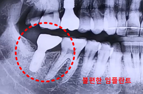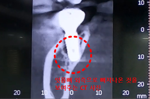 임플란트 진료를 위해 내원해 주신 환자분의 케이스입니다. 환자분은 다른 치과에서 어금니 임플란트 수술을 받은 뒤, 수술 부위 주변에 잇몸 통증이 있어 잇몸 치료도 받으셨다고 하는데요. 그래도 불편함이 해소되지 않아 본원을 찾아주신 것이라고 하셨습니다. 엑스레이 상으로는 별다른 문제가 발견되지 않았고 임플란트 역시 반듯하게 잘 심어져 있었는데, 정밀 검사를 해 보니 임플란트가 한쪽으로 치우쳐서 식립된 것을 확인할 수 있었습니다. CT 촬영에서 기울어진 형태의 치조골에, 기울어진 각도와 맞지 않게 임플란트가 식립이 된 것이 보였고 이 때문에 잇몸에 염증이 생겼던 것이죠. 이런 경우 염증의 원인이 임플란트에 있기 때문에 잇몸치료를 해 주어도 일시적으로 완화될 뿐 재발하므로, 임플란트 재수술이 필요합니다.