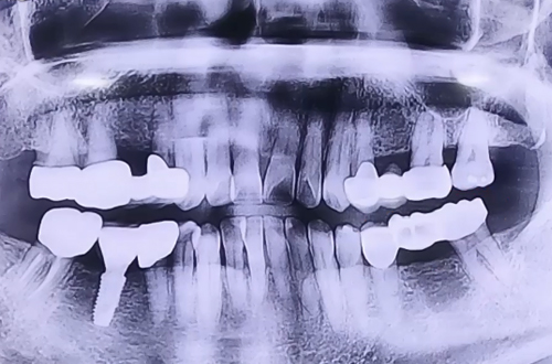 브릿지 제거 후 위아래 남은 양옆의 치아들은 보철로 이를 둘러 씌워주고 임플란트 치료를 마무리해드렸습니다.